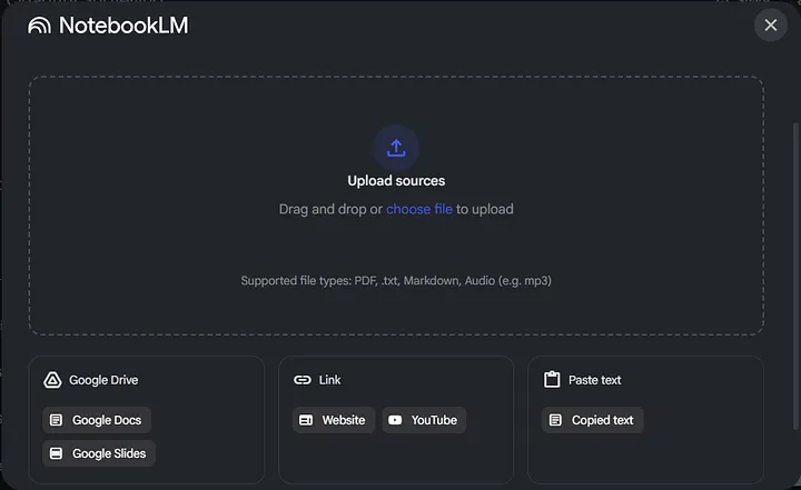 Whenever you start learning a new topic, you face an overwhelming flood of sources: PDFs, books, articles, and YouTube videos. NotebookLM solves this by letting you add up to 50 sources per notebook, including PDFs, Google Docs, Slides, Markdown files, URLs, and even audio or video files.