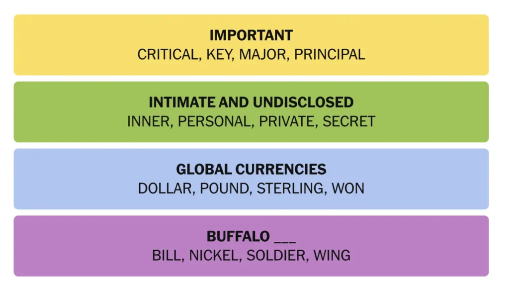 ???? The completed puzzle ties everything together into four clever categories. Today’s set wasn’t too tricky, though the “Buffalo ___” purple group may have thrown some players off.