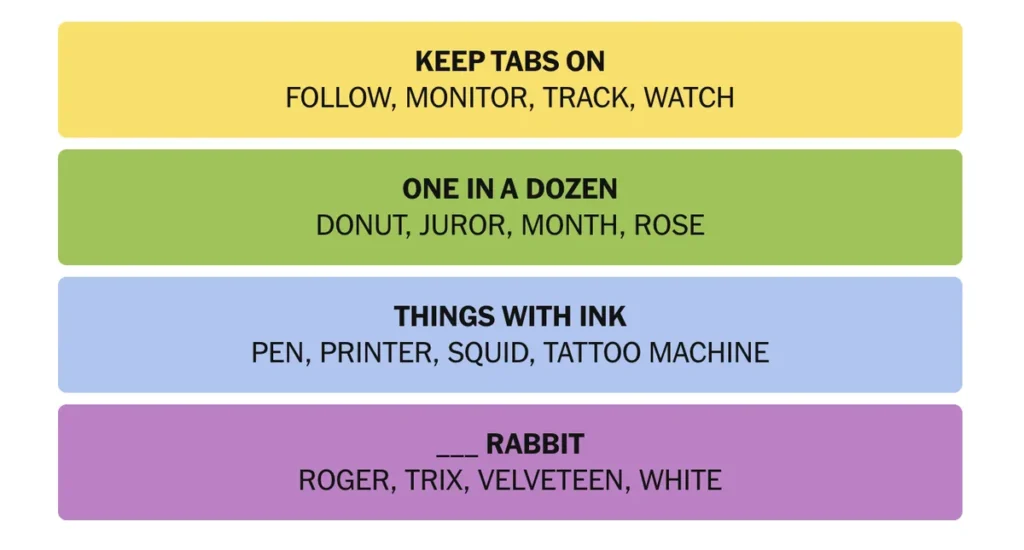 A: The puzzle includes groups like Keep Tabs On, One in a Dozen, Things with Ink, and ____ Rabbit.