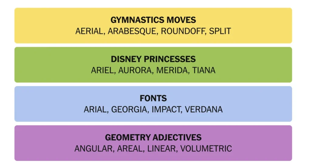 This was a playful one, especially with Ariel and Arial appearing together — a common trap that could mislead you into mixing Disney characters with typefaces. The gymnastics group may also have tripped up players unfamiliar with moves like “arabesque.”