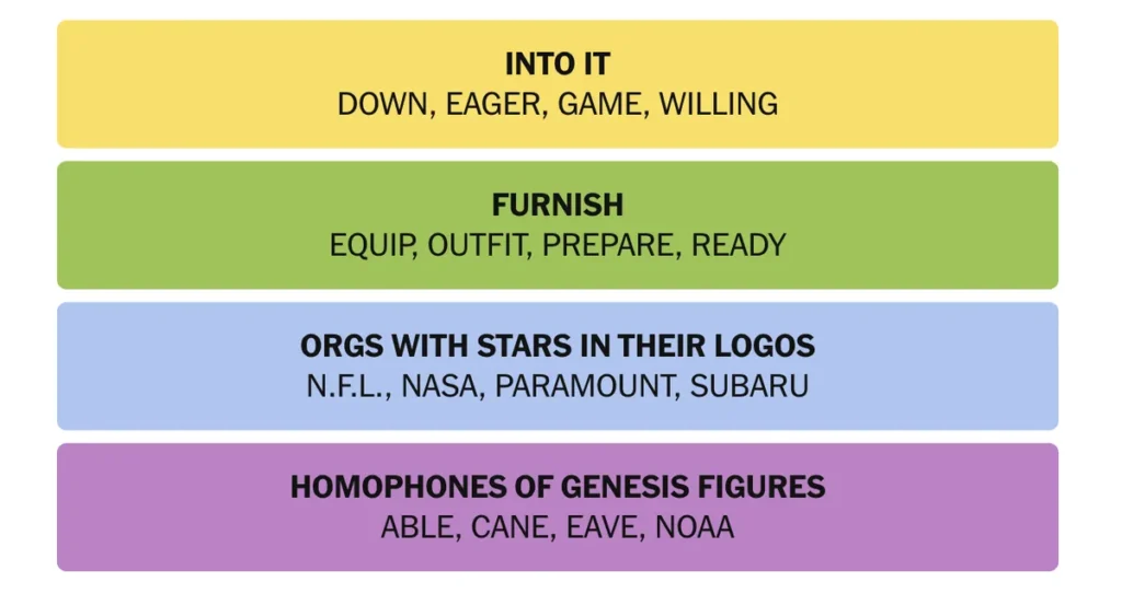 The categories are: Into It (Yellow), Furnish (Green), Orgs with Stars in Their Logos (Blue), and Homophones of Genesis Figures (Purple).