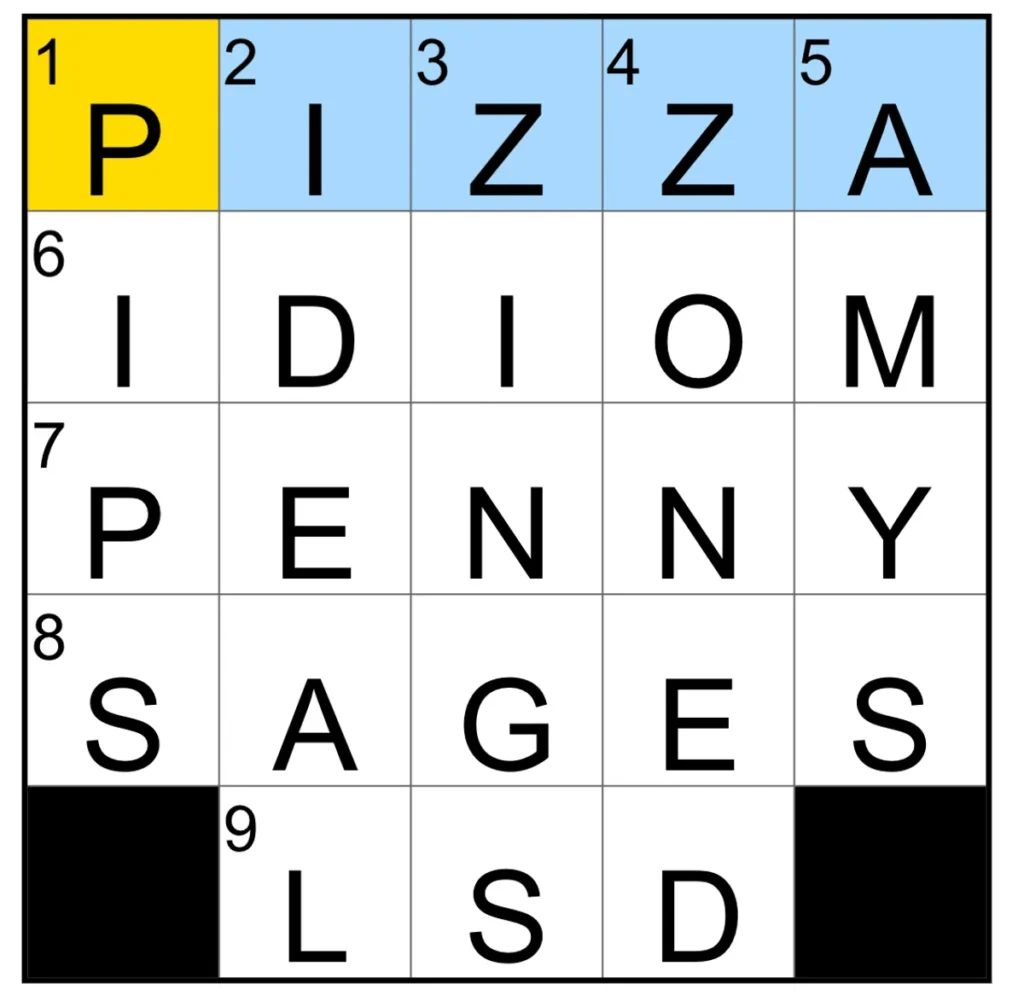 - Across: 1A PIZZA, 6A IDIOM, 7A PENNY, 8A SAGES, 9A LSD