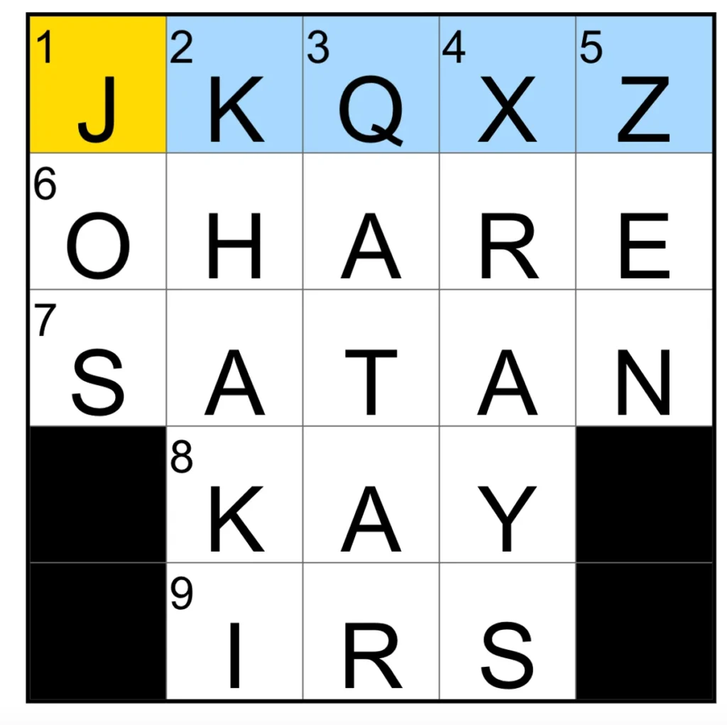 - 1A: In alphabetical order, the five letters each worth at least five points in Scrabble → JKQXZ